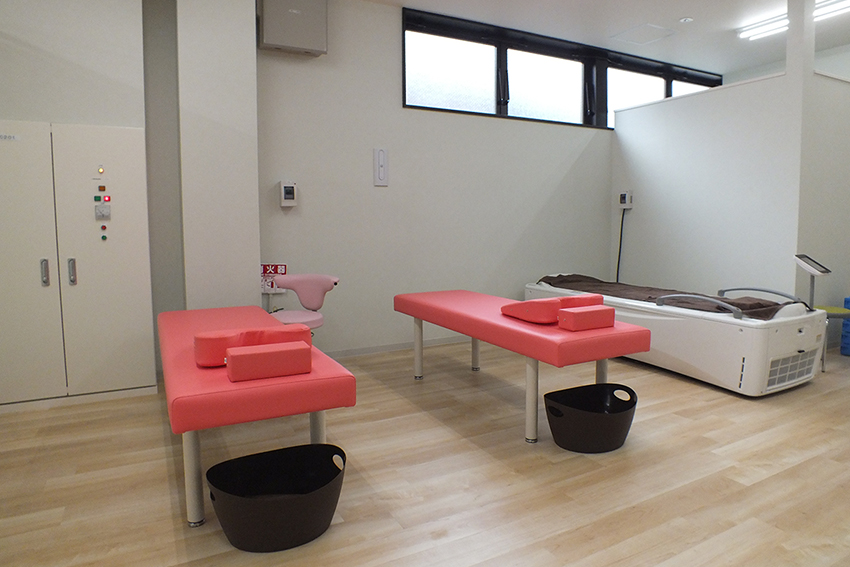 左右対称に配したノズルから噴射される水の圧力を利用して全身マッサージをします。 水本来の流体特性を応用し、ウォーターベッドならではの浮遊感に抱かれながら、手技治療(マッサージや按摩、指圧)のような力強い・心地よい刺激が得られ、肩凝り、腰痛、ストレスによる不眠・頭痛・冷え症などにも効果があります。